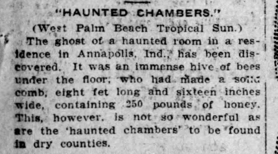 OCR: “HAUNTED CHAMBERS.” ‘(West Palm Beach Tropical Sun.) S , j The ghost of a haunted room in a residence in Annapolis, Ind. has been discovered. It was an immense hive of bees under the floor, ‘who had made a solid comb; eight fet long and ‘sixteen inches wide, containing 250 pounds of honey. This, however, is not so wonderful as re the ‘haunted chambers’”‘ be ‘found In dry counties.