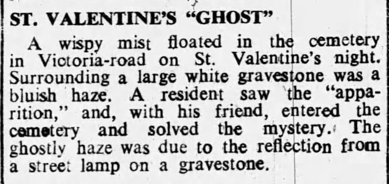 OCR: ST. VALENTINES “GHOST” A wispy mist floated in the cemetery in Victoria-road on St Valentine’s night. Surrounding a large white gravestone was a bluish haze. A resident saw “the “apparition” and, with his friend, entered the cemetery and solved the mystery. The ghostly haze was due to the reflection from a street lamp on a gravestone.