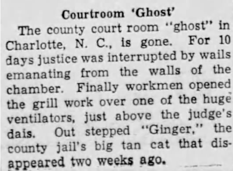 OCR: Courtroom ‘Ghost’ | The county court room “ghost” in Charlotte, N C is gone. For days justice was interrupted by wails emanating from the walls of the chamber. Finally workmen opened the grill work over one of the huge ventilators just above the judge’s dais. Out stepped “Ginger” the county jail’s big tan cat that disappeared two weeks ago.